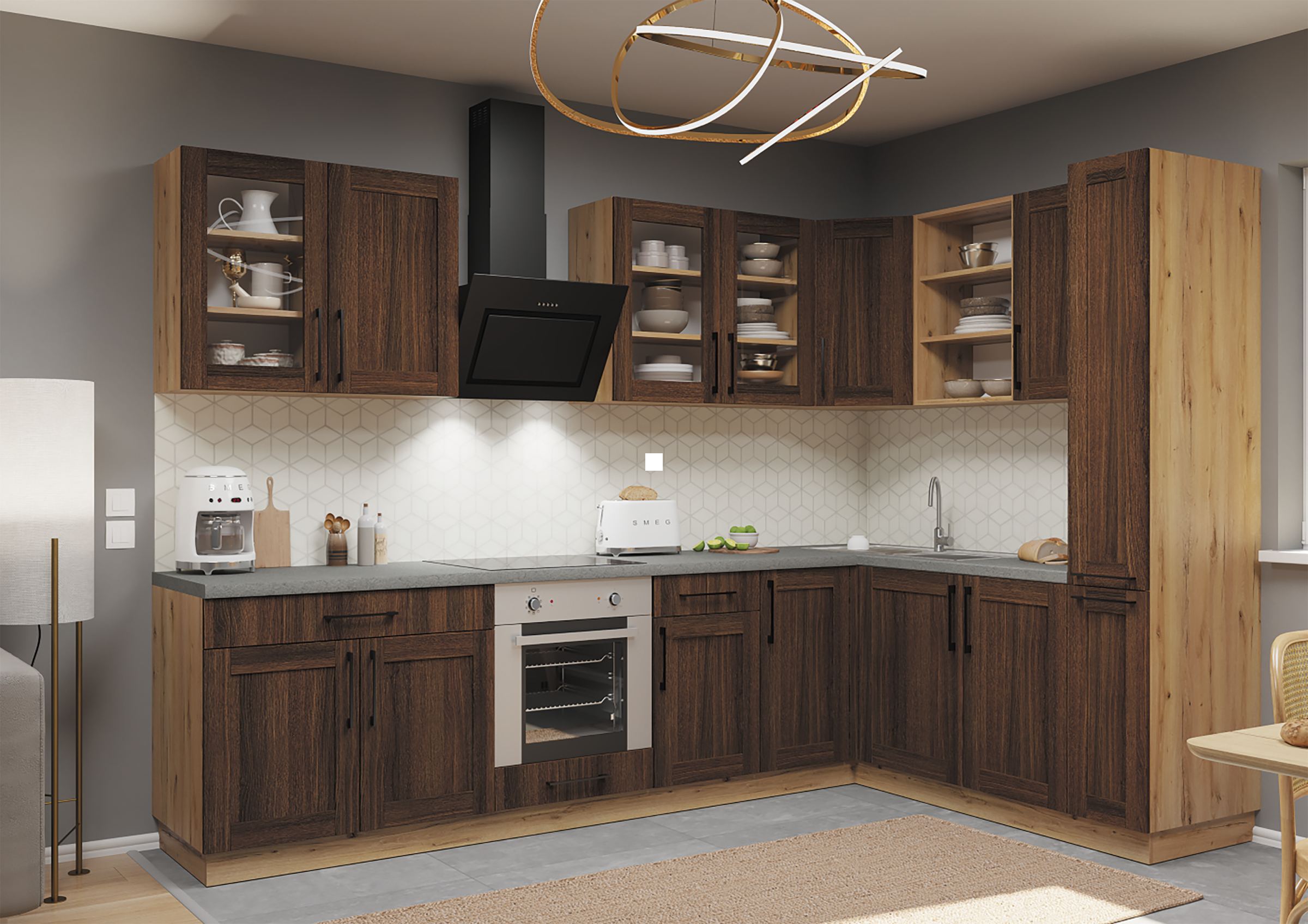 Keretes ajtófront. Többféle fogantyúból lehet választani. Elemválasztékával mindenféle variációjú konyha megvalósítható, legyen az egyes, L vagy akár U alakú kiosztás.